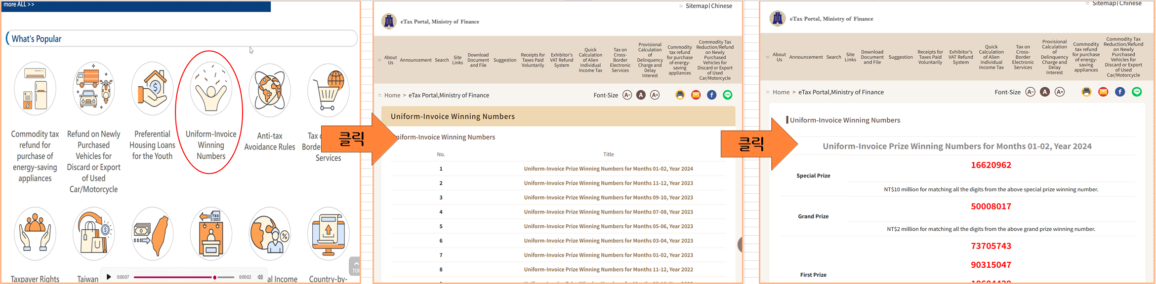 - 영수증 복권 관련 자세한 내용은 대만 국세청 홈페이지 (https://www.mof.gov.tw/Eng) 에서 확인할 수 있습니다.