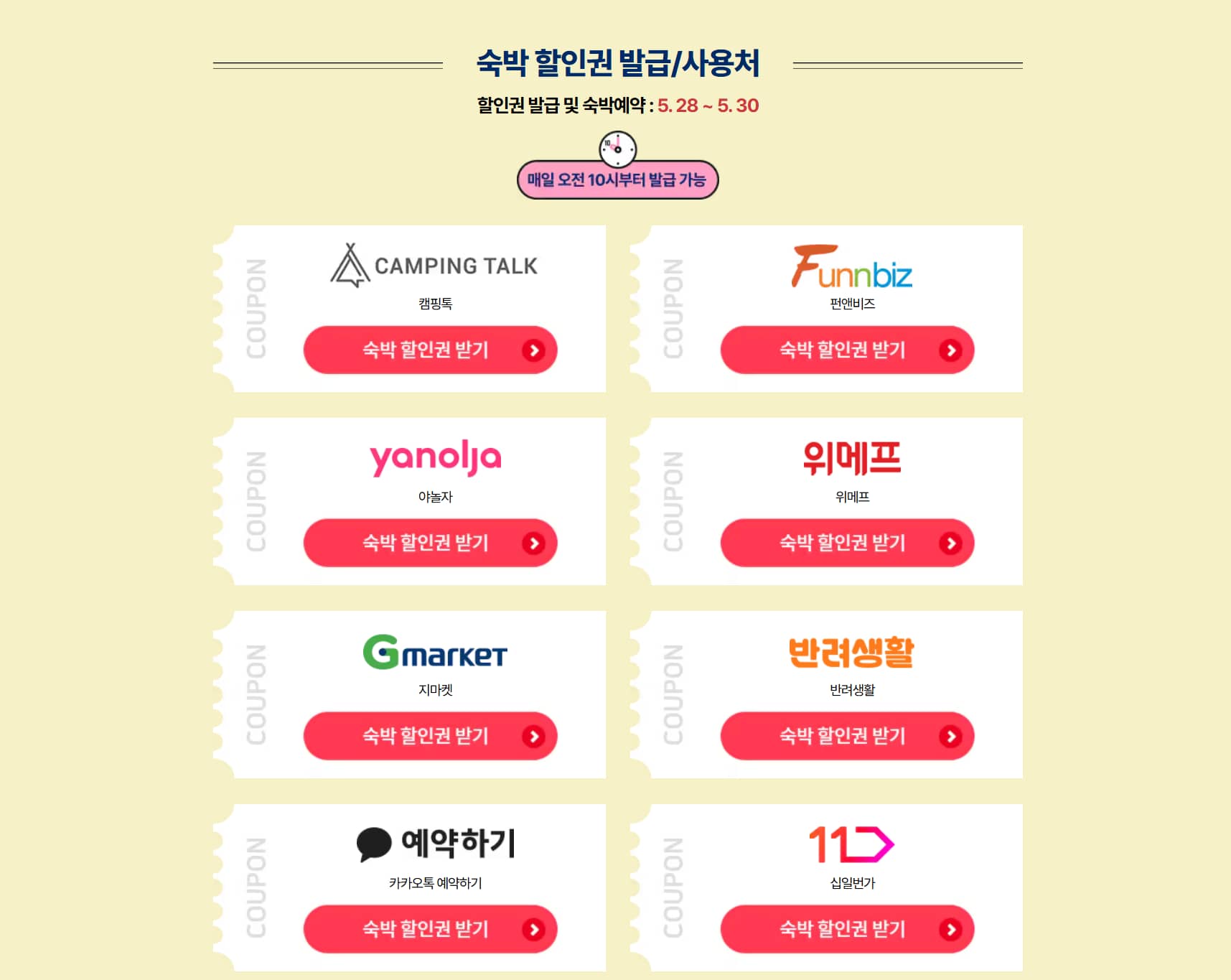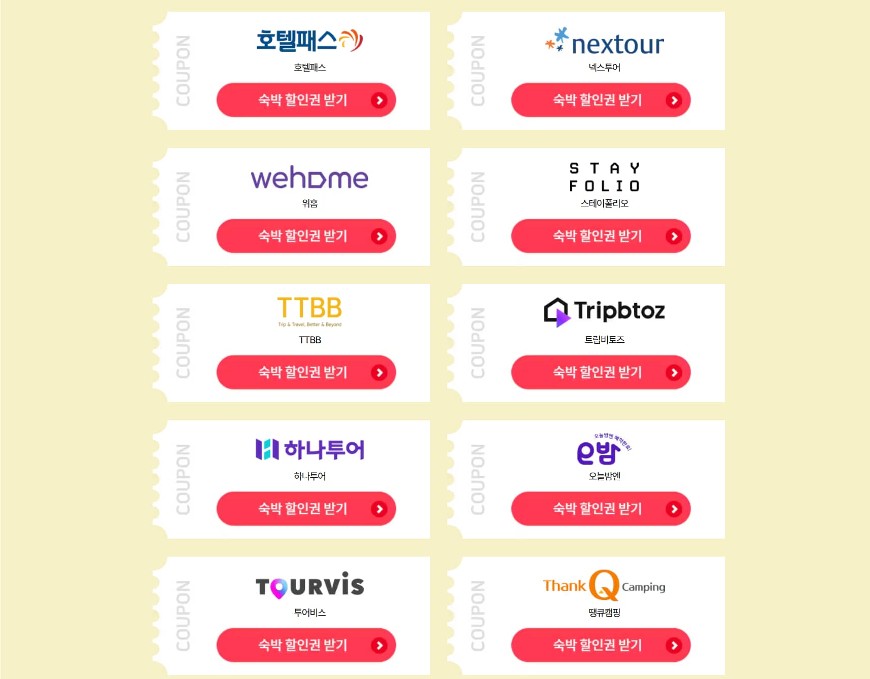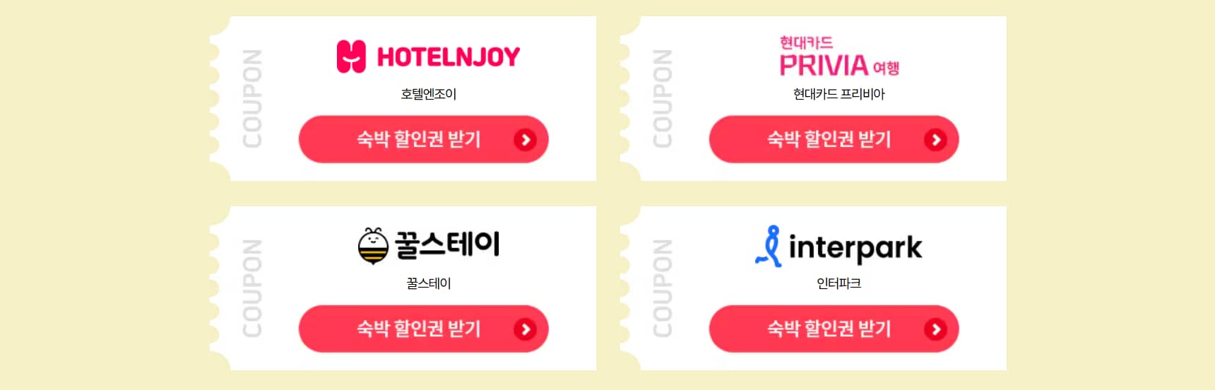 - 참여 방법: 숙박 세일 페스타 사이트 내 온라인 여행사를 통한 숙박 할인원 발급(1인 1매 사용 가능, 매일 선착순)