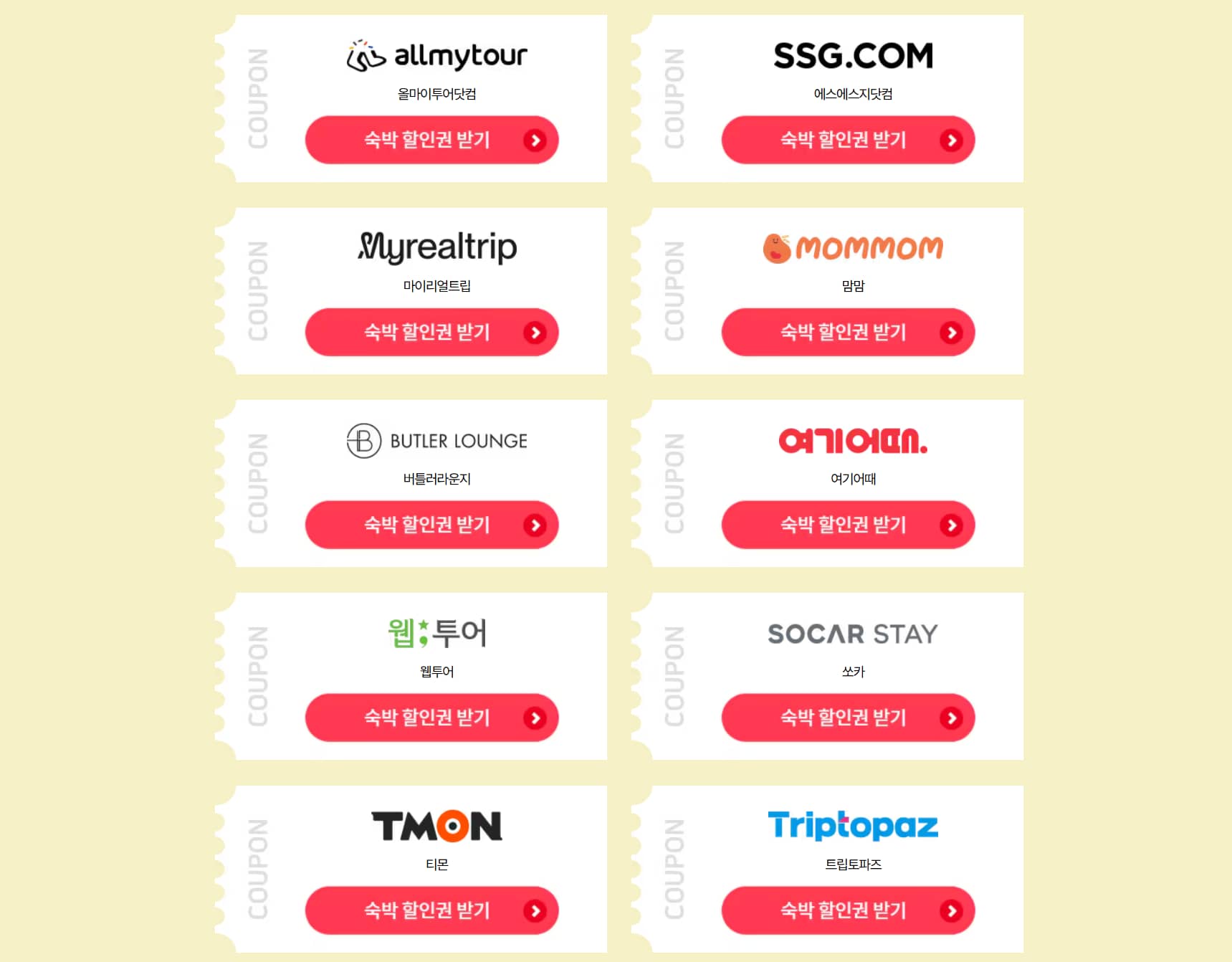 - 숙박 할인권 발급/사용처: 숙박 세일 페스타 사이트에 들어가시면 아래 발급/사용처가 있습니다. 각 발급/사용처에서 따로 하는 이벤트가 많으니 꼭 이용해 보세요!!